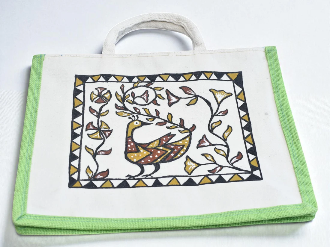 This Birsa Craft Green Big Jute Bag features authentic Sohrai painting, showcasing traditional tribal artistry. Crafted from durable jute, it offers ample space for shopping while being eco-friendly. The vibrant green base complements the intricate hand-painted design, making it both a practical and stylish accessory for everyday use. Ideal for those who appreciate sustainable products with cultural significance.